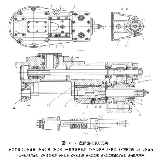 滾齒機經長期使用后,滾刀架部件容易出現主軸徑向圓跳動和軸向竄動超差、后支架與主軸同軸度誤差增大等故障。其主要原因是主軸與滾刀刀桿磨損,前滑動軸承13、后支架滑動軸承17及銅套8磨損所致。