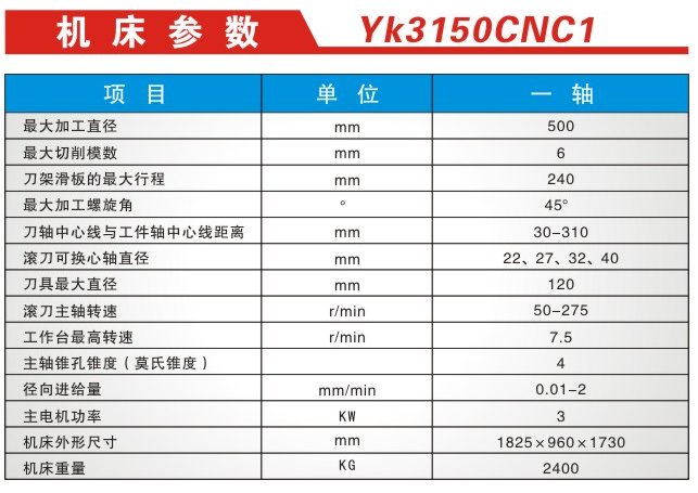 YK3150CNC1數控滾齒機,實現工作臺徑向進給(X軸)的伺服控制。主要用于直齒輪、斜齒輪、渦輪、鼓形齒輪、小錐度齒輪。