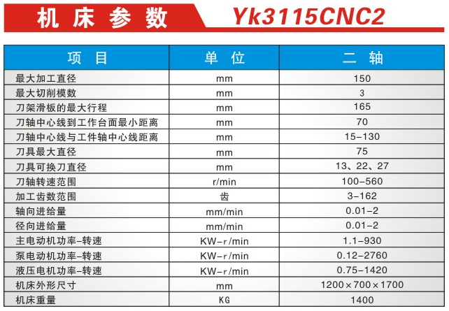 機床特點: YK3115CNC2數控滾齒機,實現工作臺徑向進給(X軸)和刀架滑板軸向進給(Z軸)的伺服控制。 主要用于直齒輪、斜齒輪、渦輪、鼓形齒輪、小錐度齒輪。 適用于汽車、摩托車